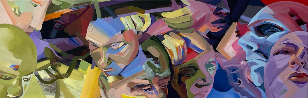 Dans cette recherche-création, j’examine tour à tour trois postures : celle de voyeuse, de voleuse et de mutante. [Voyeuse] j’épie les gens, j’absorbe le flux visuel circulant sur les réseaux sociaux (Instagram, Meta, YouTube) et je parcours les sites de diffusion en continu fréquentés à profusion (Netflix, Crave, Porn Hub) : je cherche la répétition des corps, les codes du dévoilement de la chair, l’ancrage des standards occidentaux. Puis [voleuse], je m’approprie et je détourne les images sélectionnées. Je crée des liens entre elles par le traitement de la matière. Je les fusionne et [mutante] je cherche à créer des amalgames métamorphosés. Tout en étant ancrée dans l’observation du réel, j’utilise la peinture, son potentiel de fiction et ses effets du hasard par la matière pour déconditionner le regard en société de contrôle, d’accélération, de productivité et d’hyperconnectivité.